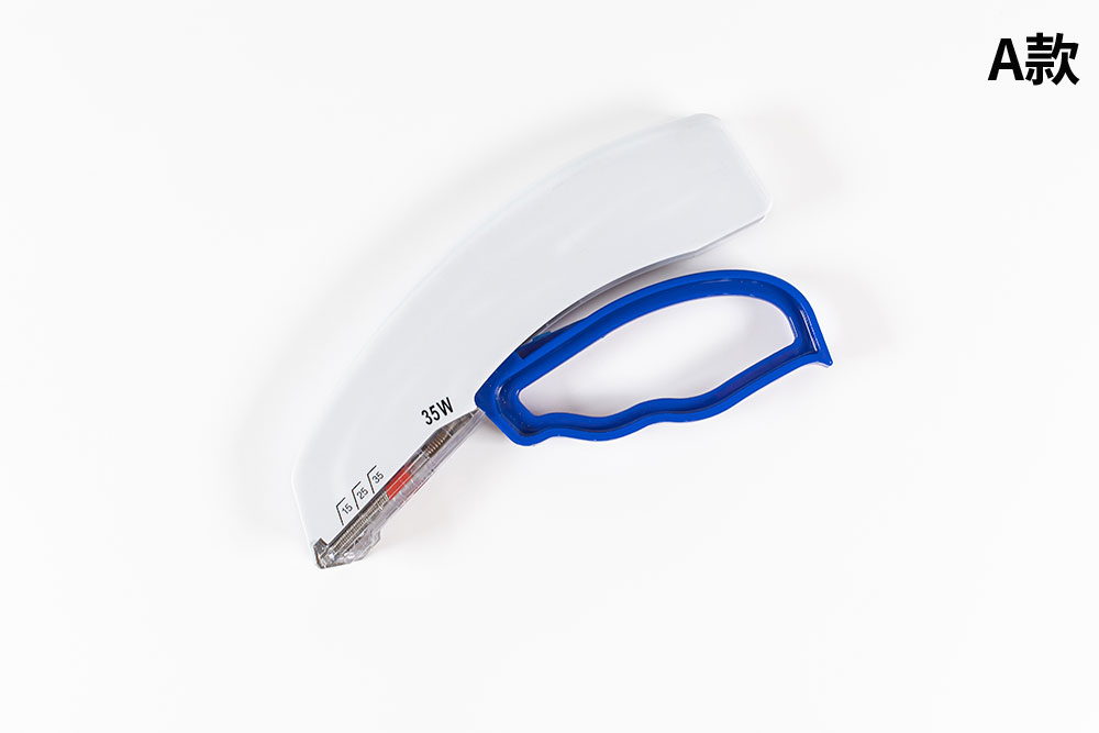 一次性使用皮肤缝合器由缝合钉、器身构成。器身由外壳、击发手柄、推块、弹簧、钉成型件、压钉板、弹片、钉仓组成。