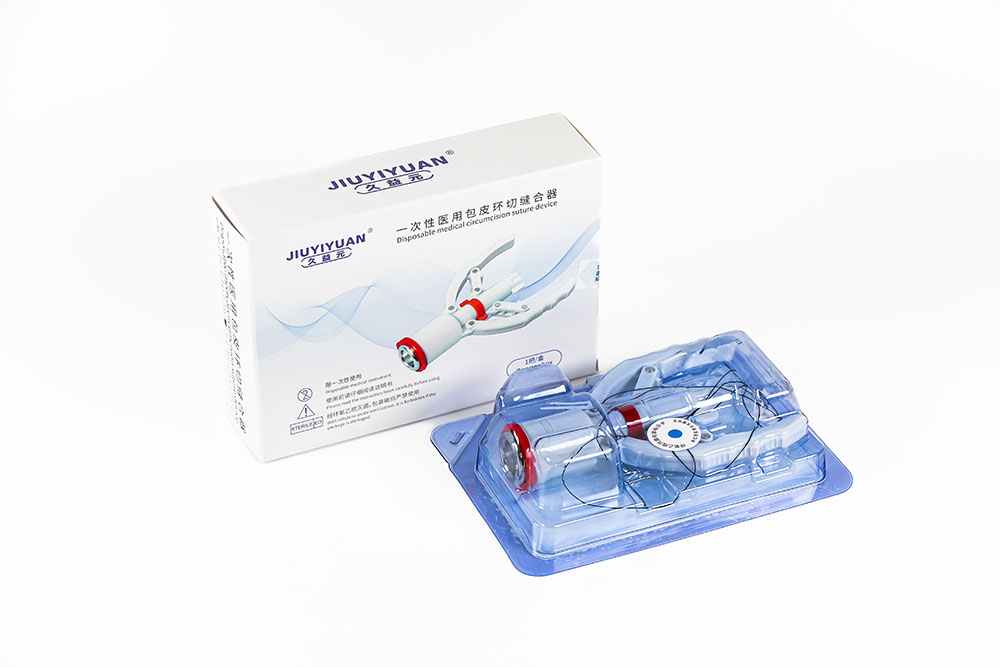 B型一次性医用包皮环切缝合器由钟形龟头座、钉仓套、推钉片、环形刀、定位弹簧、移动器、保险块、活动手柄、调节旋钮、活动连接杆、钉仓、缝合钉、钉仓保护盖、扎带、丝线构成。