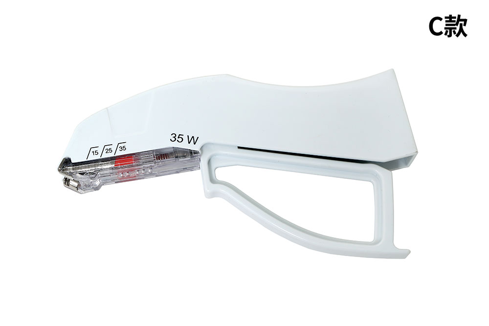 一次性使用皮肤缝合器由缝合钉、器身构成。器身由外壳、击发手柄、推块、弹簧、钉成型件、压钉板、弹片、钉仓组成。
