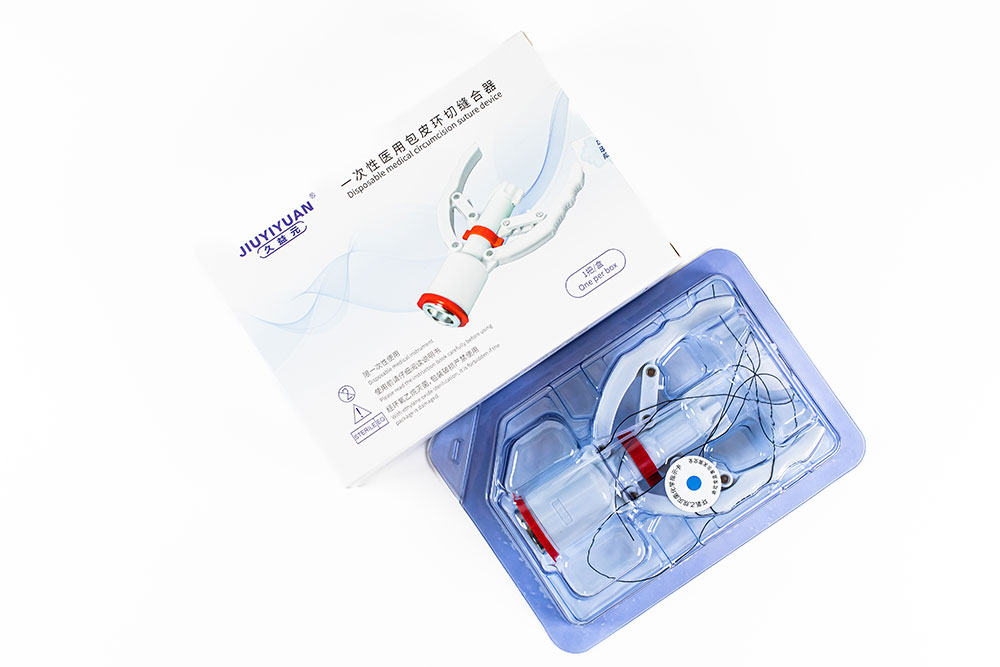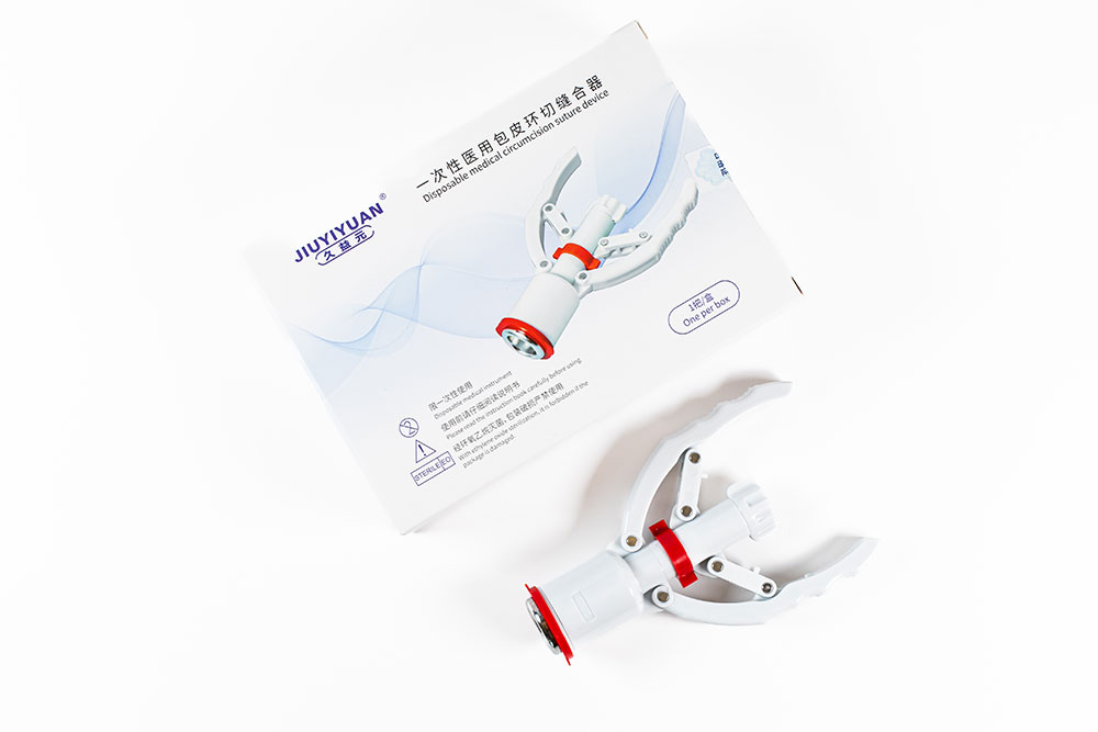 B型一次性医用包皮环切缝合器由钟形龟头座、钉仓套、推钉片、环形刀、定位弹簧、移动器、保险块、活动手柄、调节旋钮、活动连接杆、钉仓、缝合钉、钉仓保护盖、扎带、丝线构成。